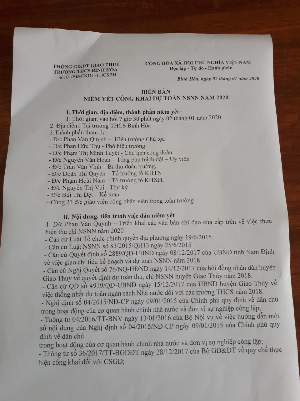 Quyết định về việc công bố công khai dự toán ngân sách năm 2020 của trường THCS Bình Hòa